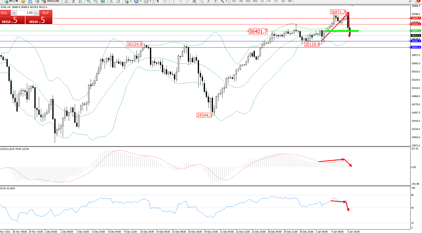 道琼斯指数DJ30——4小时K线图显示: