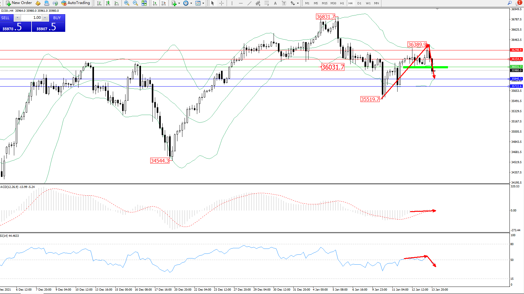 道琼斯指数DJ30——4小时K线图显示: