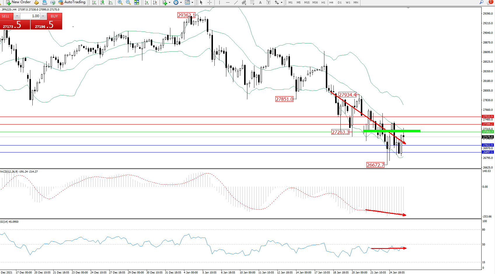 日经指数JPN225——4小时K线图显示: