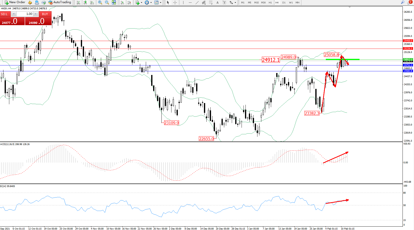 恒指HK50 ——4小时K线图显示: