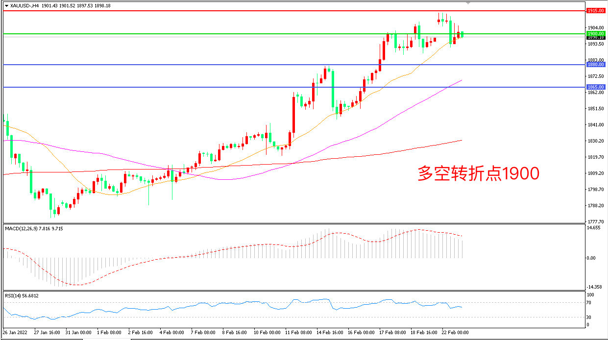 周二(2月22日),俄罗斯承认乌克兰东部两个地区为独立的共和国并下令部署军队后,俄乌局势进一步激化,欧美分别宣布了针对俄罗斯的新一轮制裁,在避险情绪的推动下,现货黄金延续强势表现,收报1898.18美元/盎司。近期俄乌局势如果继续升级,金价还将迎来飙涨。