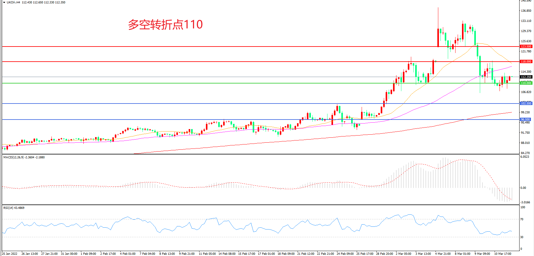 4小时图看,油价连续下破后窄幅震荡短期走势有所企稳110美元成为多空分水岭,MACD红柱缩短,RSI指标走平,日内延续震荡概率较大。