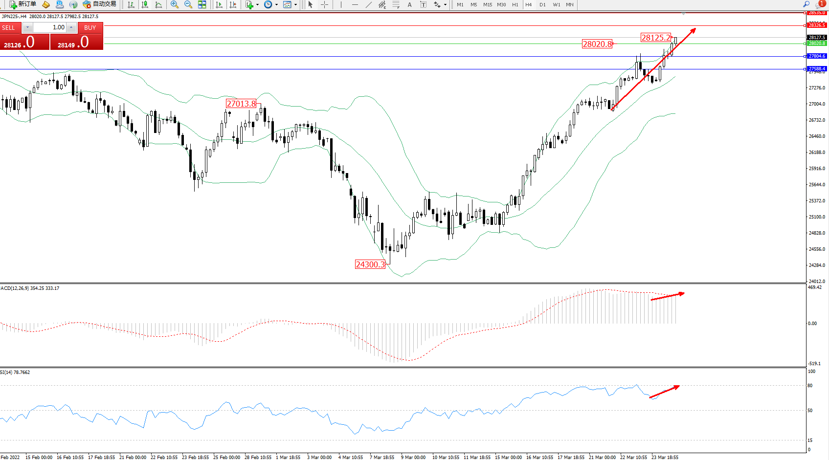 日经指数JPN225——4小时K线图显示: