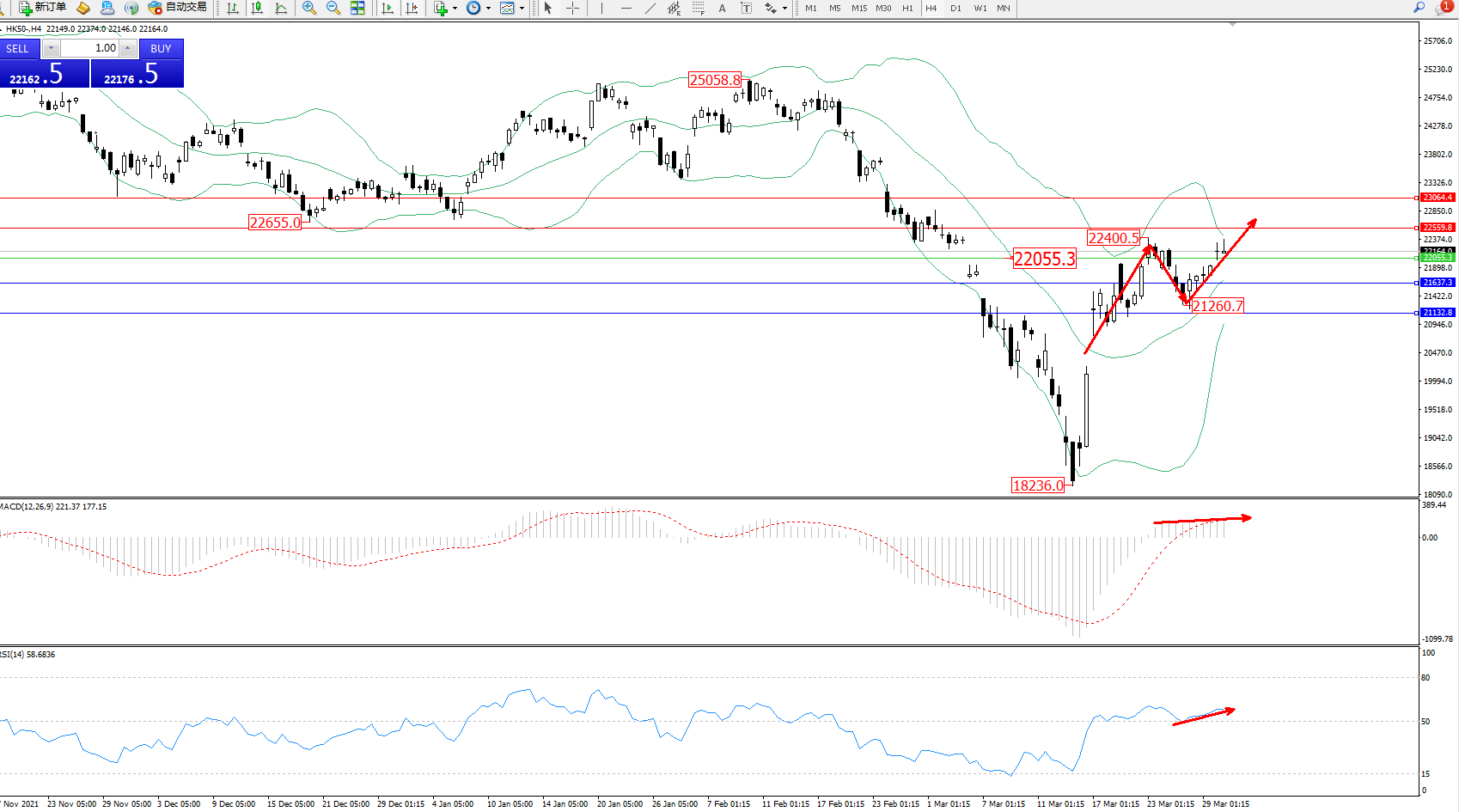 恒指HK50 ——4小时K线图显示:
