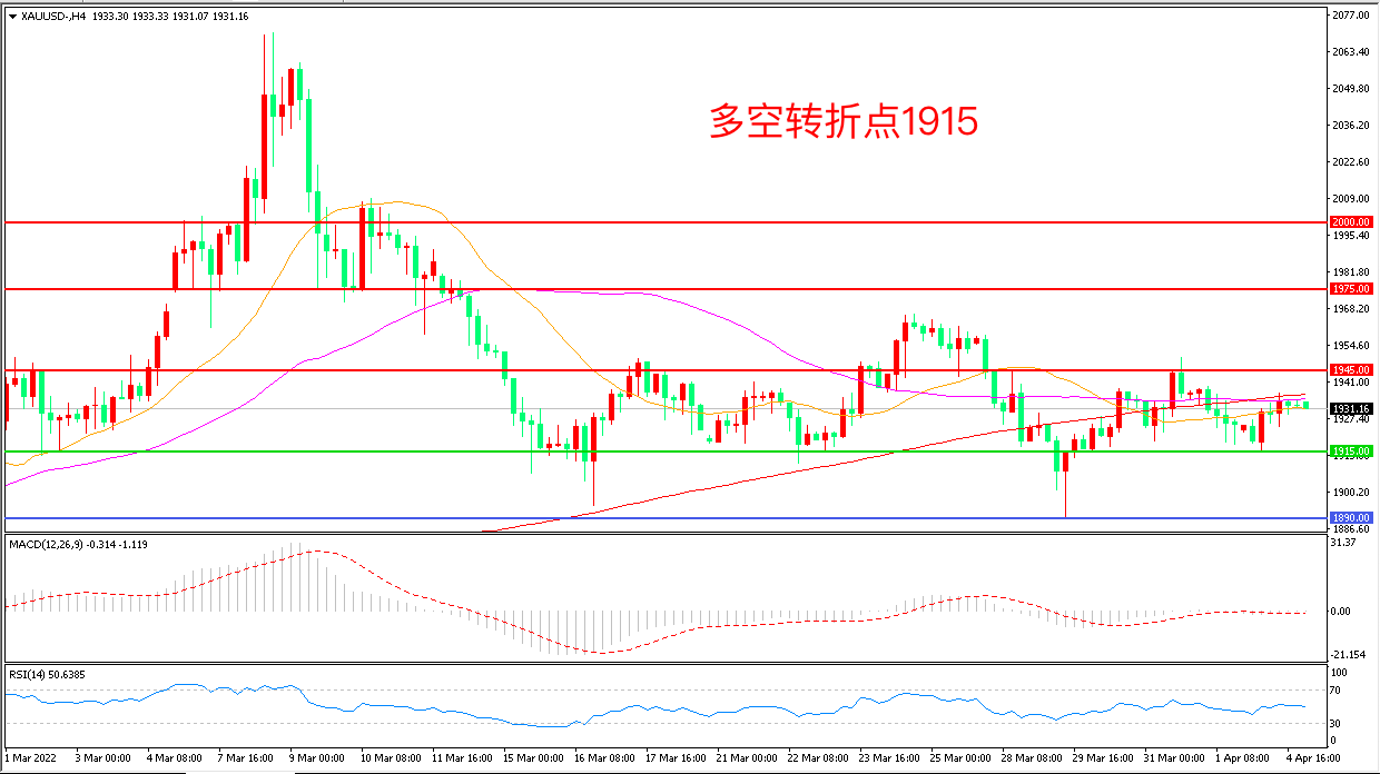 4小时图看,金价回踩1915一线附近反弹,区间震荡迹象明显,均线系统走平, MACD绿柱缩短,RSI指标走平,日内延续震荡概率较大。