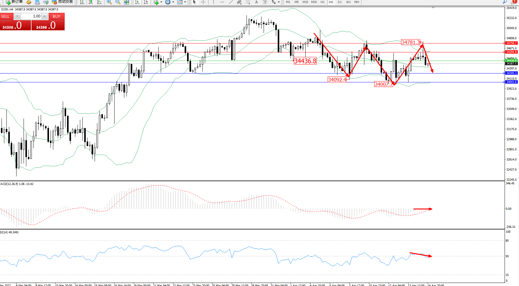 道琼斯指数DJ30——4小时K线图显示: