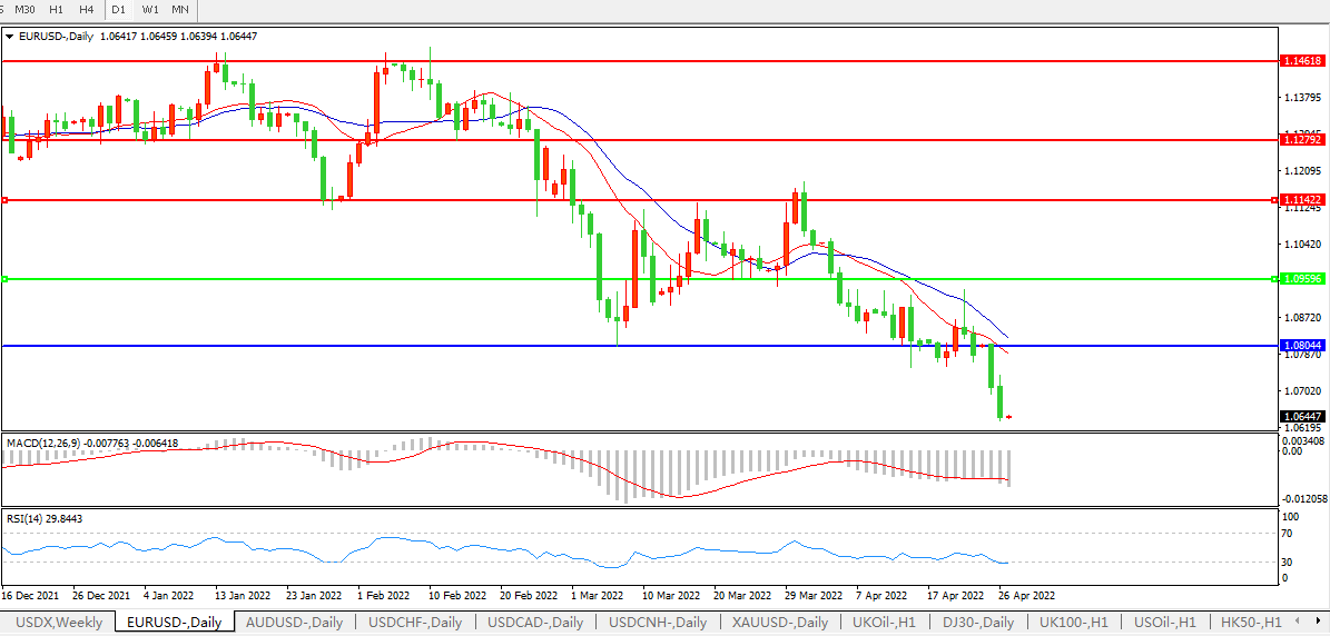 欧元兑美元下跌0.69%,至1.0636美元,为2020年3月以来最低水平。有报道称,俄罗斯根据亚马尔合同向波兰供应的天然气已经停止,欧元进一步下跌。由于担心乌克兰战争将冲击欧洲地区经济,同时也由于预期欧洲央行在加息方面的行动将比美联储慢得多,欧元受到重创。