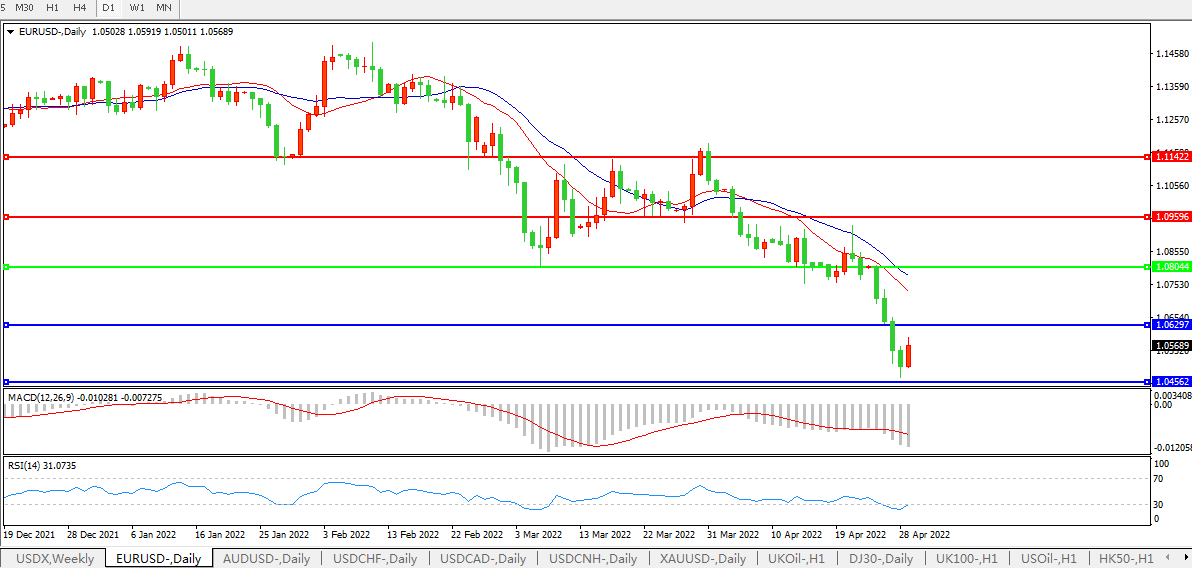 欧元兑美元上涨0.46%至1.0545,双向成交温和,在欧元区公布通胀数据后,欧洲债券收益率走高;欧洲央行首席经济学家Philip Lane称,该地区不会重返低通胀轨道,并对经济增长前景发出警告;欧元4月累计下跌4.6%。