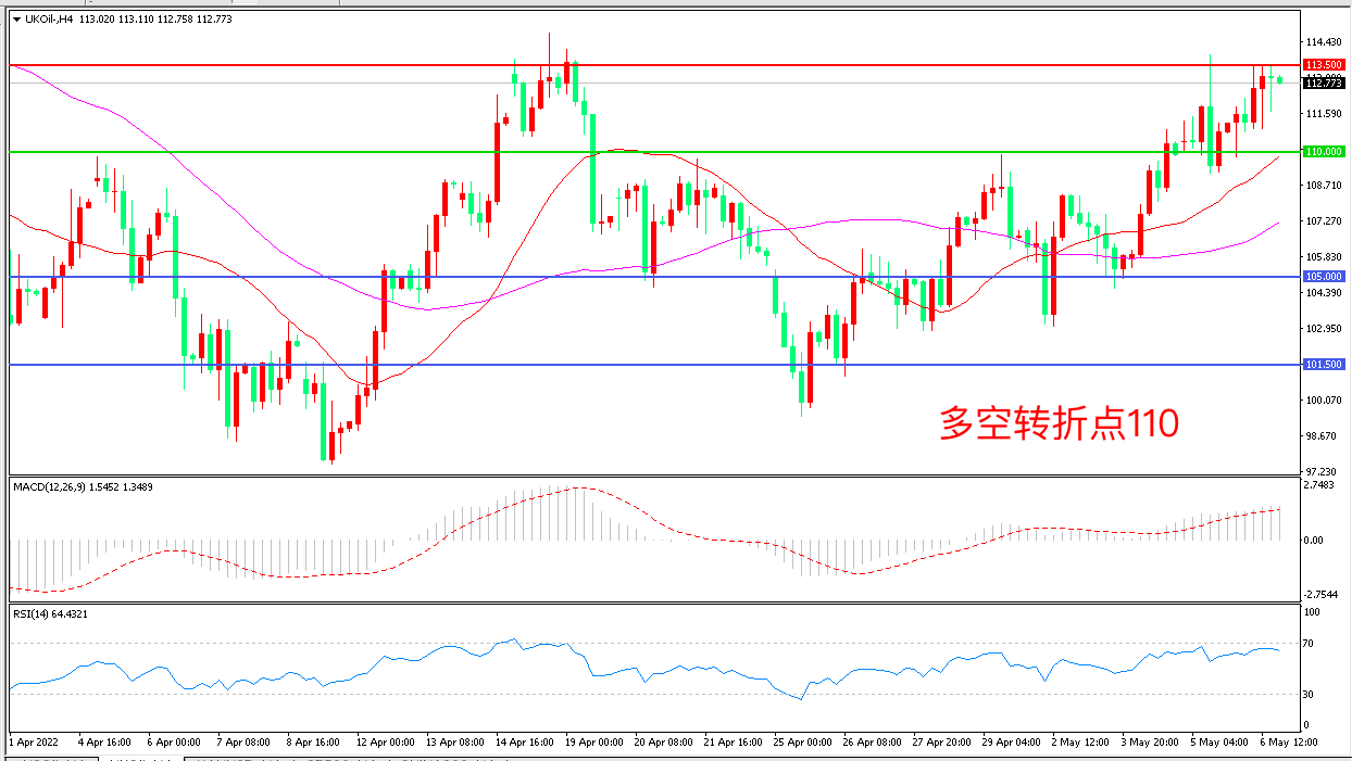 4小时图看,油价以110为依托震荡上行,短期走势偏强,均线系统拐呈多头排列,MACD红柱增加,RSI指标走平,日内上行概率较大。