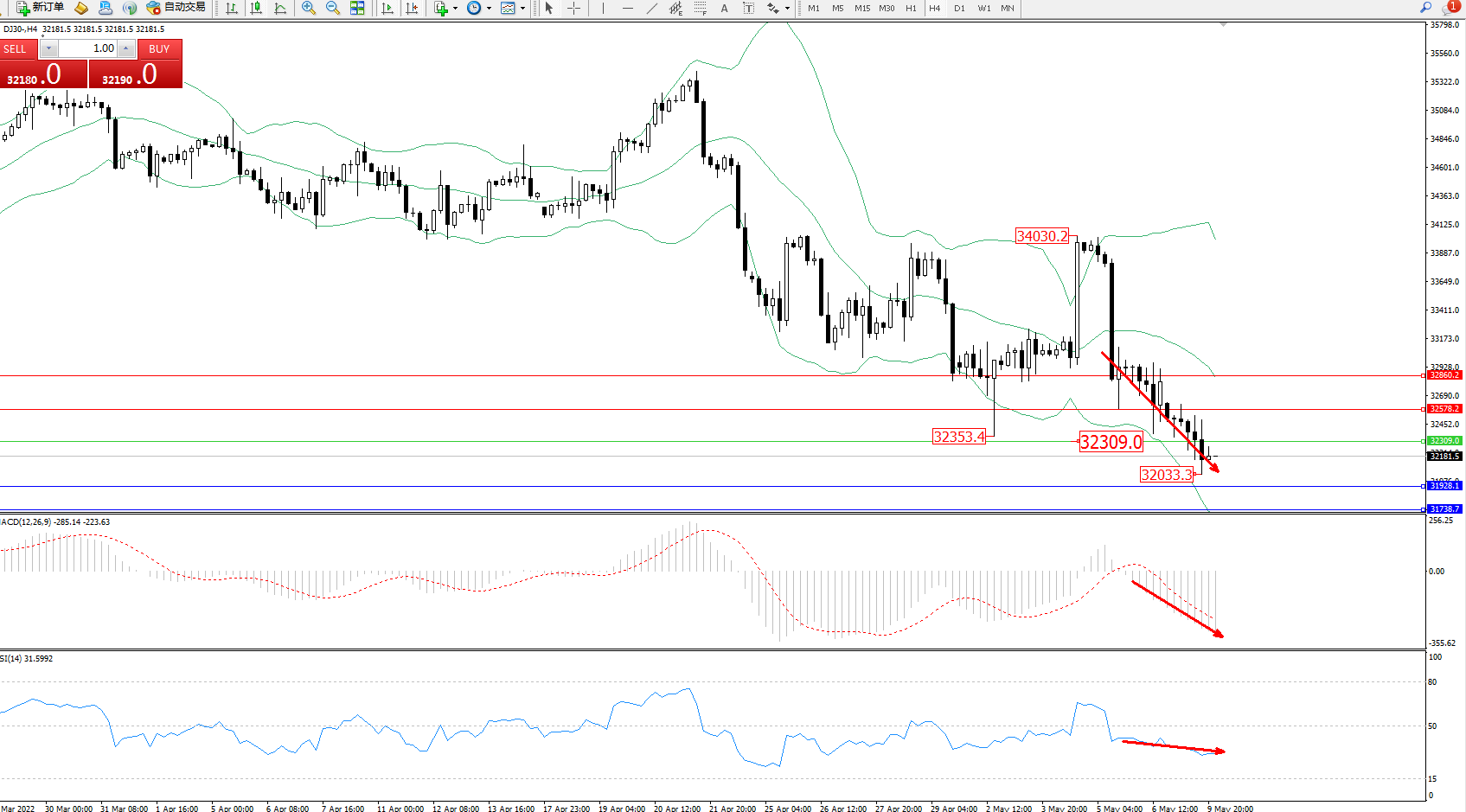 道琼斯指数DJ30——4小时K线图显示:
