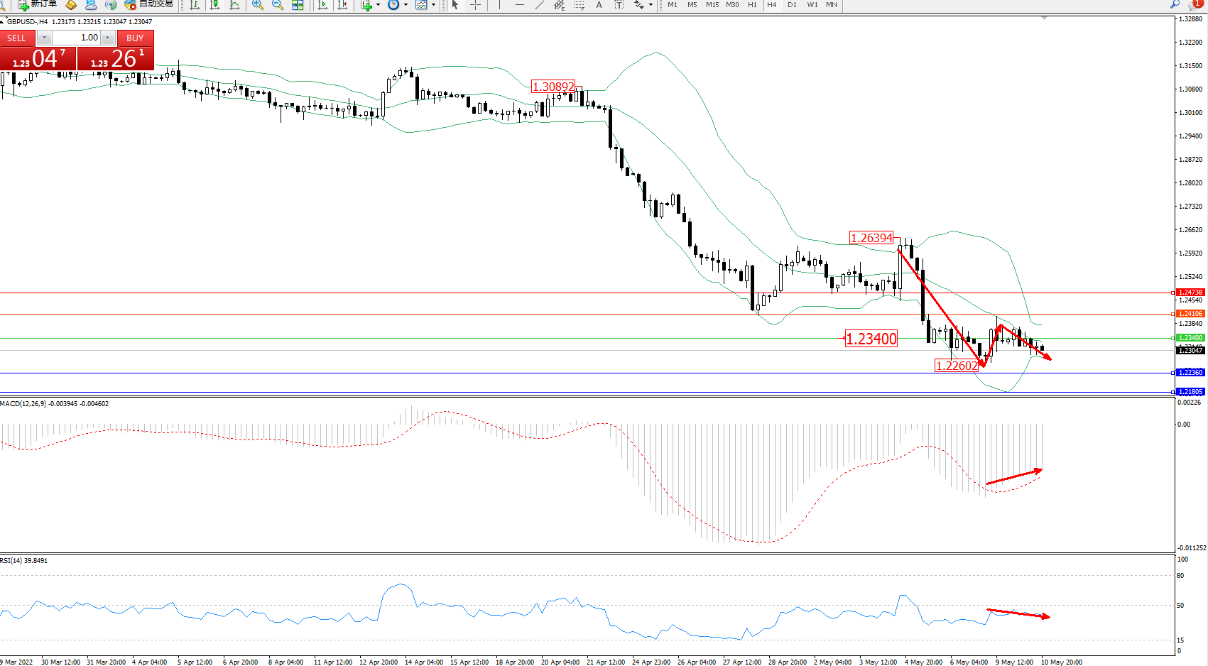 交易策略:1.23400下方看跌,目标1.22360、1.21805