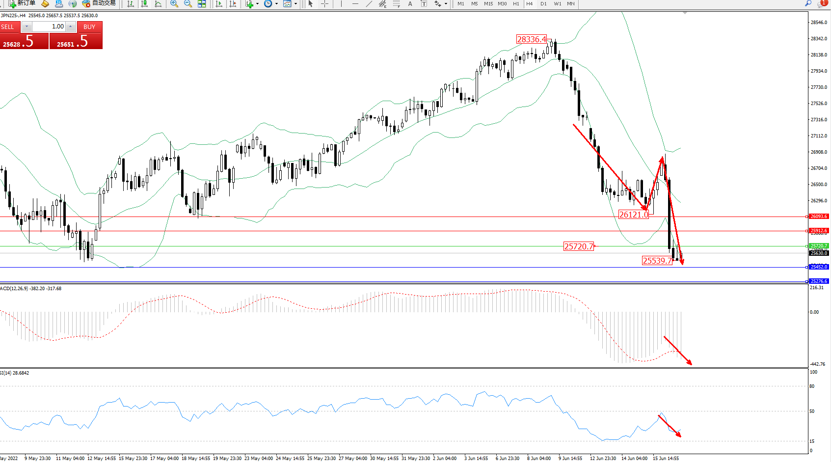 日经指数JPN225——4小时K线图显示: