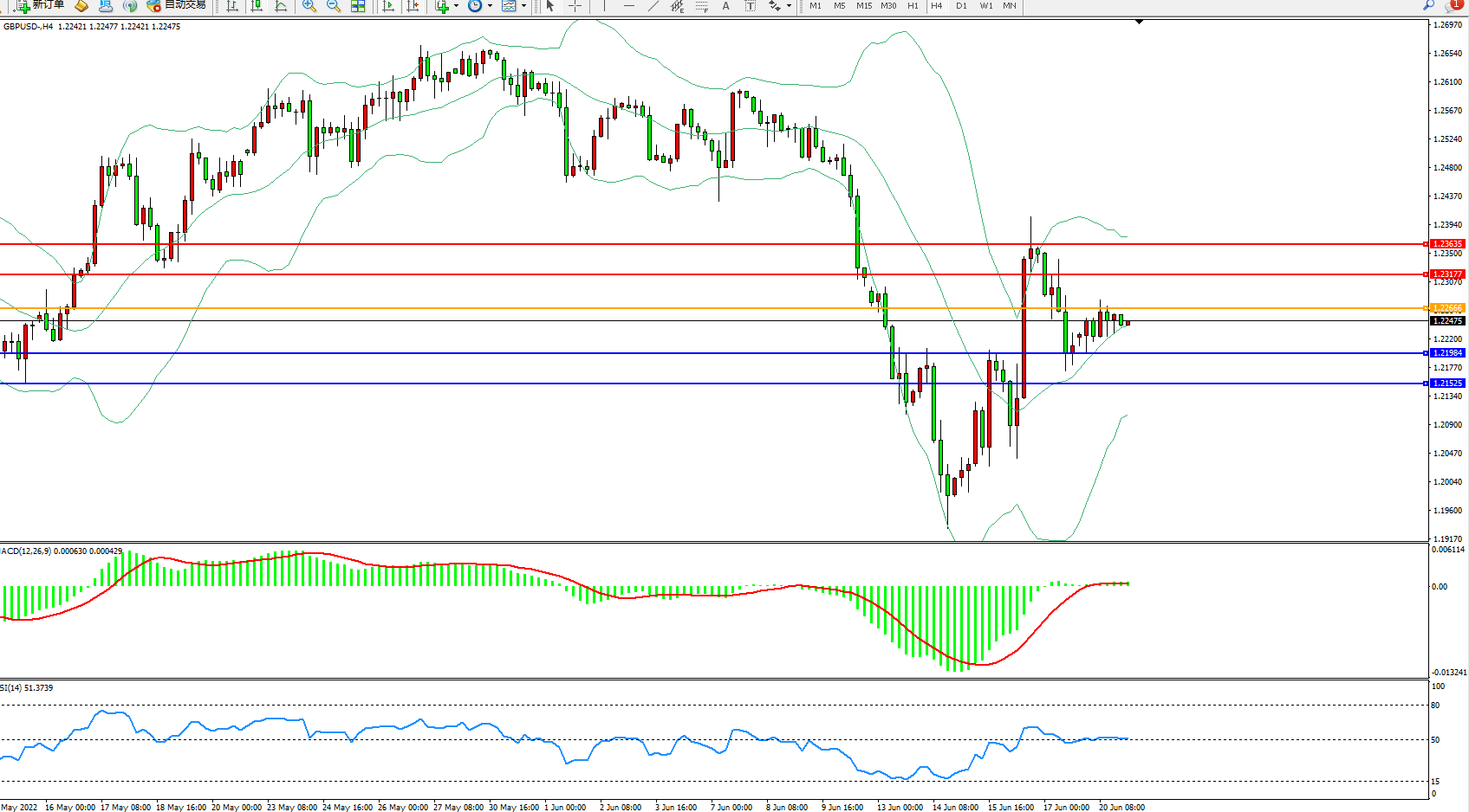 交易策略:1.22666下方看跌,目标1.21984、1.21525