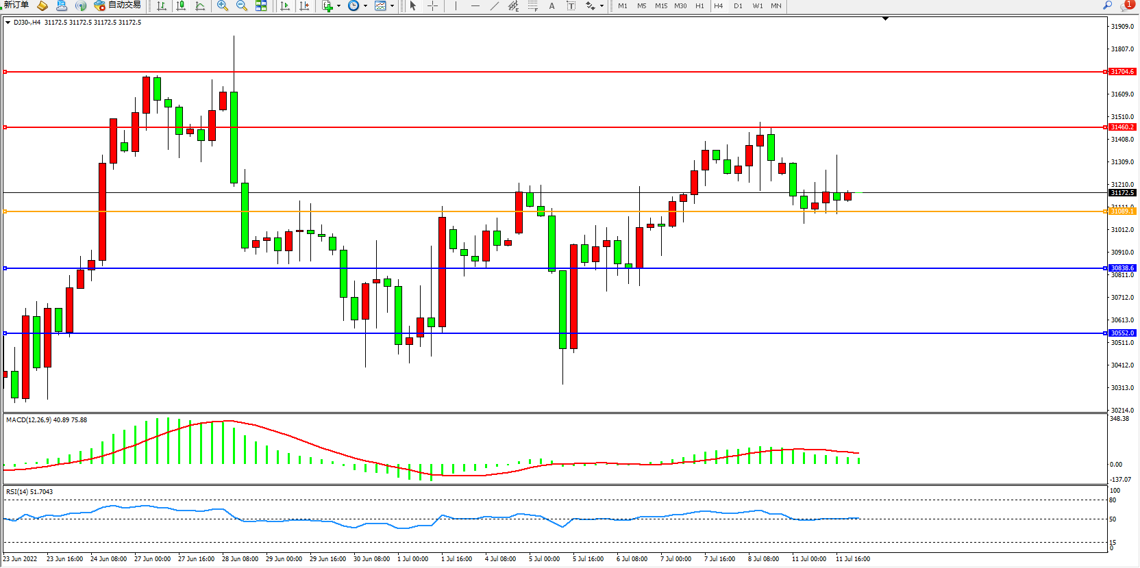道琼斯指数DJ30——4小时K线图显示: