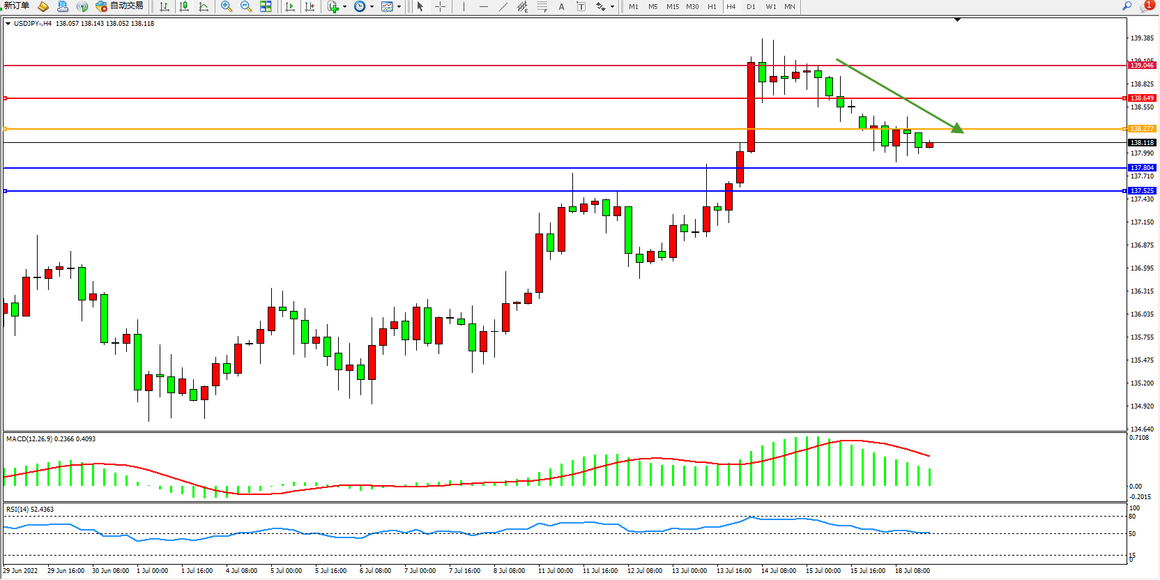 交易策略:138.277下方看跌,目标137.804、137.525