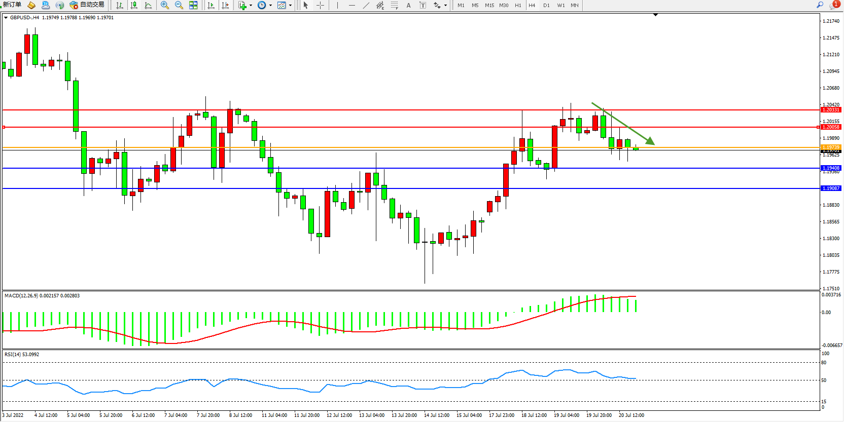 备选策略:1.19739上方看涨,目标1.20058、1.20331