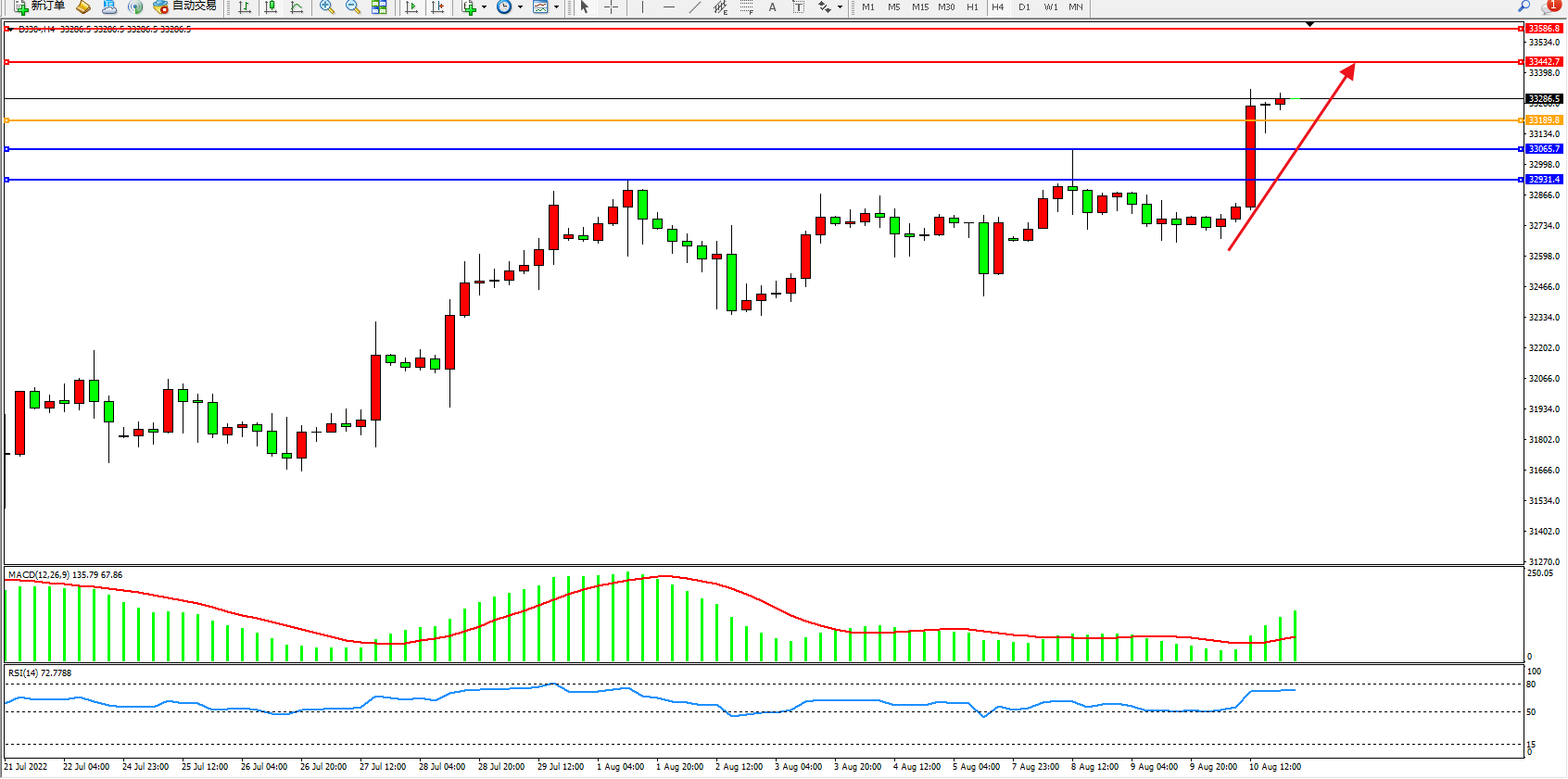 道琼斯指数DJ30——4小时K线图显示: