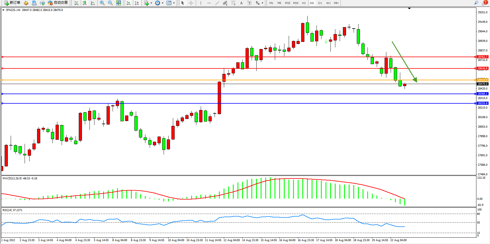 日经指数JPN225——4小时K线图显示: