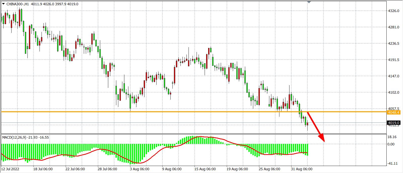 1小时图看,沪深300再度跌破4020延续跌势,趋势依旧偏空,MACD于零轴之下量能继续放大,行情大概延续跌势,当前阻力已下移至4048附近,日内在4048之下继续看跌为主,目标4000-3950