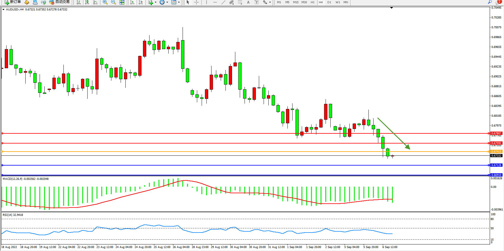 交易策略:0.67415下方看跌,目标0.67126、0.66910