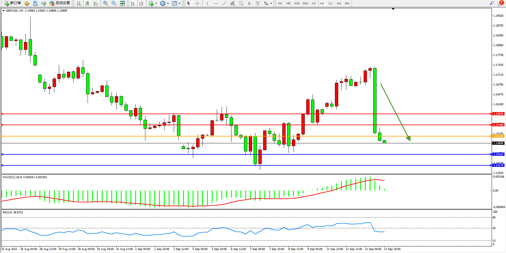 交易策略:1.15122下方看跌,目标1.14535、1.14179