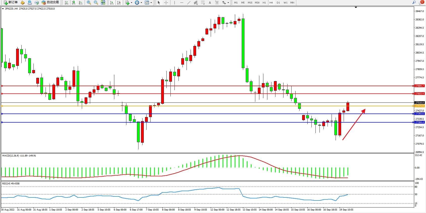 日经指数JPN225——4小时K线图显示: