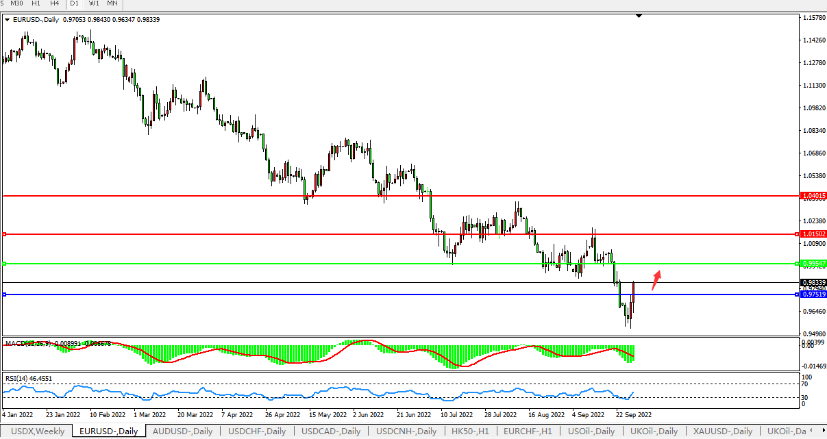 欧元兑美元上涨0.7%,至0.9804,数据显示,欧元区9月份经济景气度大幅下降,且降幅超过预期,因为企业和消费者信心下降,他们对未来几个月的通胀趋势也持悲观态度。