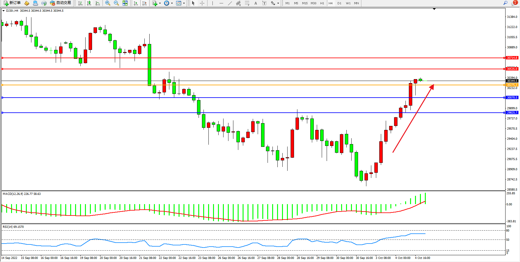 道琼斯指数DJ30——4小时K线图显示: