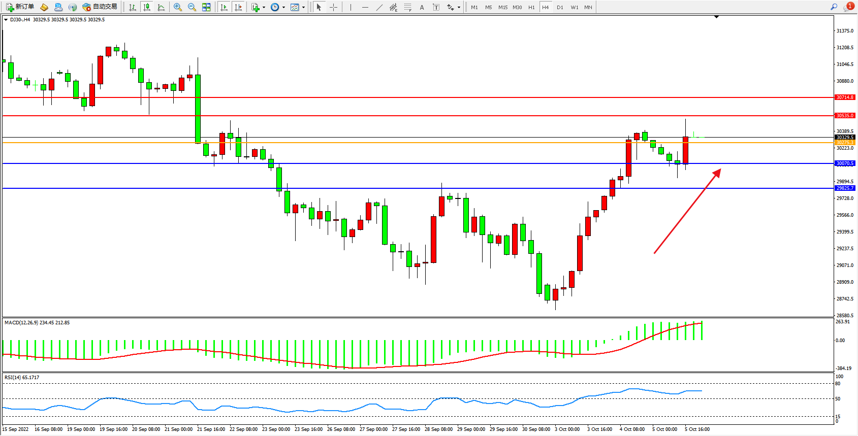 道琼斯指数DJ30——4小时K线图显示: