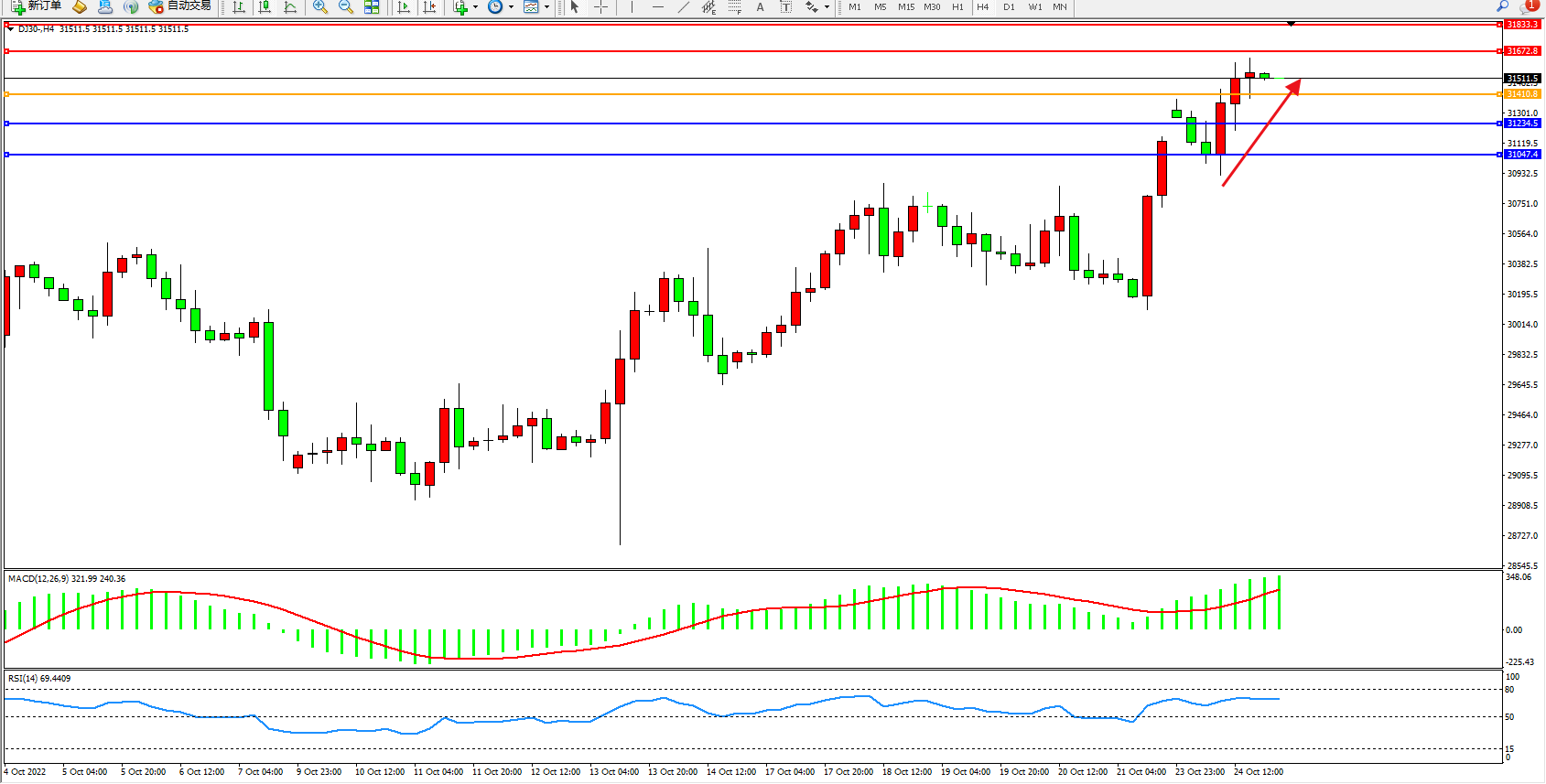 道琼斯指数DJ30——4小时K线图显示: