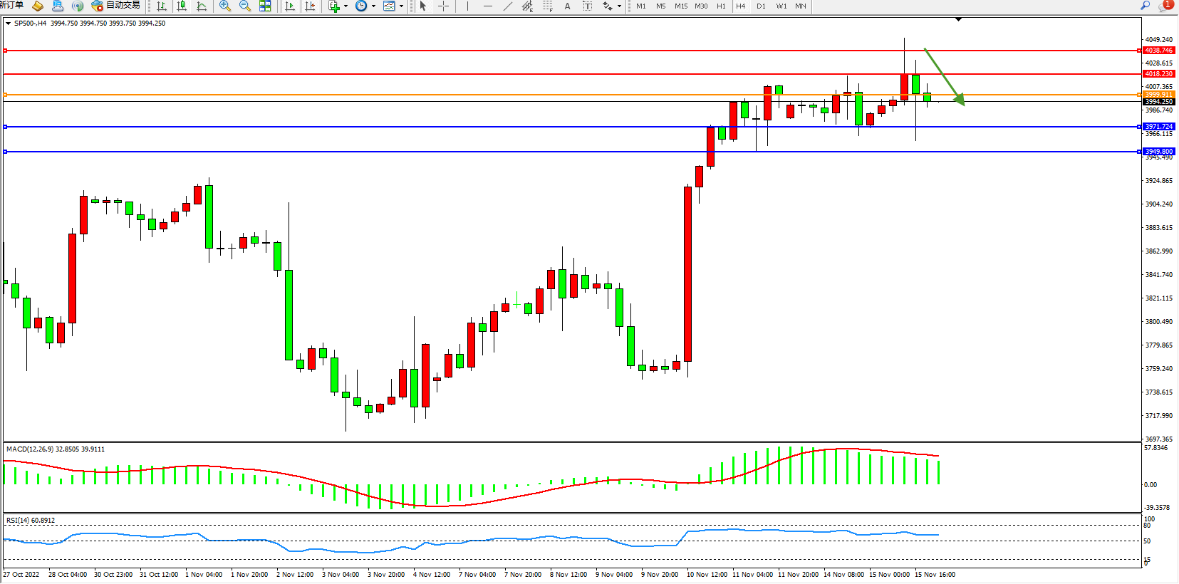 标普500指数11月15日(周二)收盘上涨34.90点,涨幅0.88%,报3992.15点;地缘紧张关系缓和以及人们对美联储放缓加息步伐的信心增强,多头再度涌入全球股市。随着美国国债收益率和美元下跌,美国公布的经济数据弱于预期,许多人认为,这将使美联储在连续加息75个基点后改为加息50个基点。