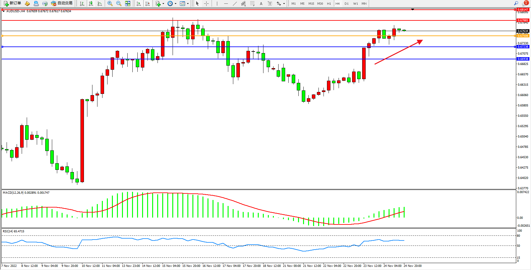 澳元美元AUDUSD——4小时K线图显示: