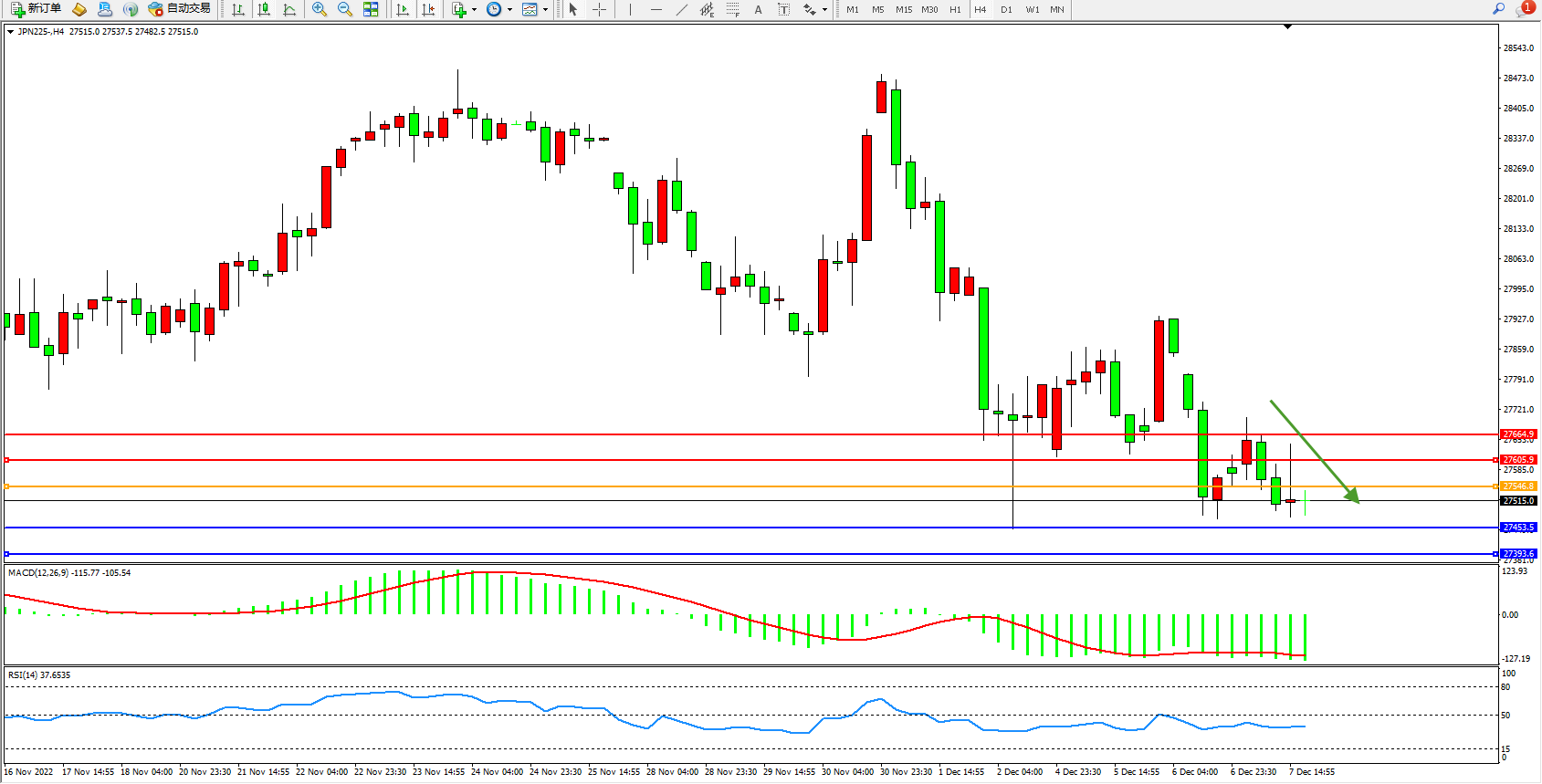 日经指数JPN225——4小时K线图显示: