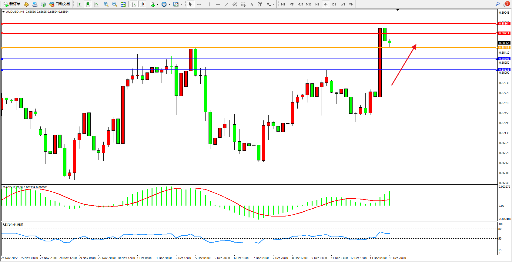 交易策略:0.68485上方看涨,目标0.68711、0.68864