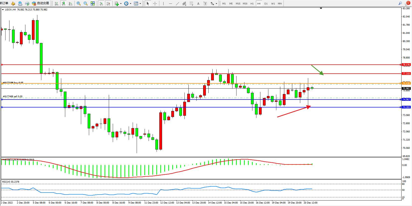 交易策略:76.438下方看跌,目标74.967、74.265