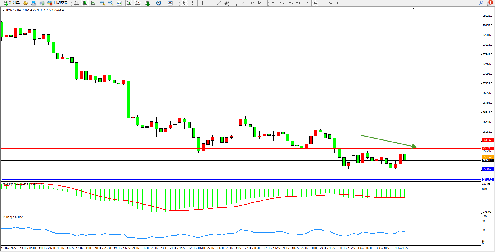日经指数JPN225——4小时K线图显示: