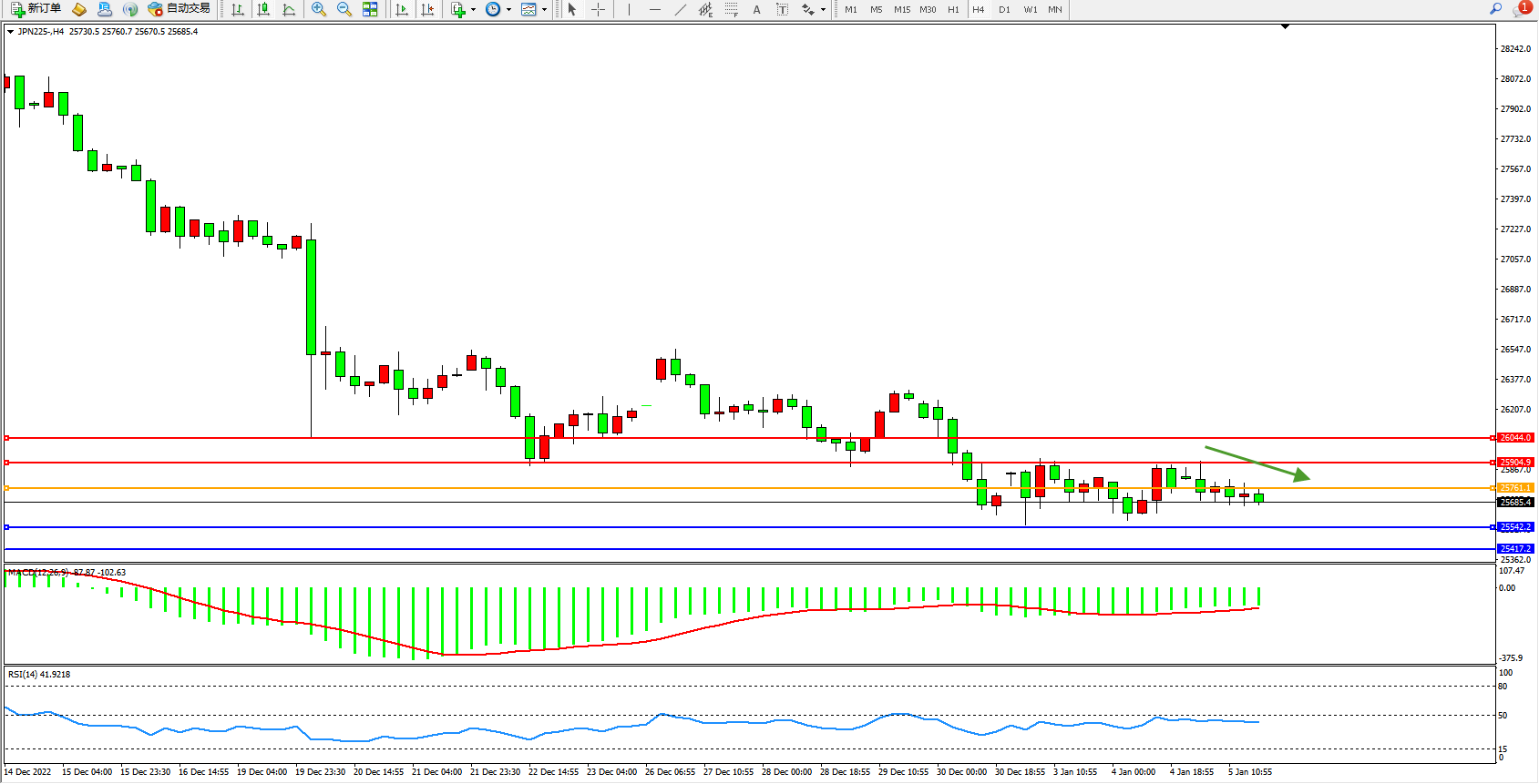 日经指数JPN225——4小时K线图显示: