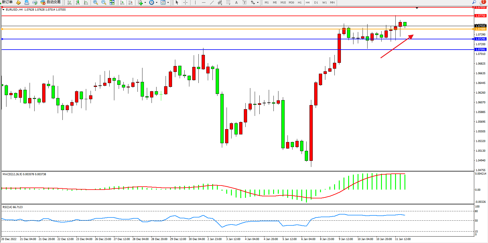 欧元美元EURUSD—4小时K线图显示: