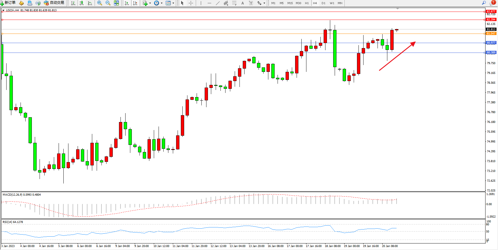 原油USOil——4小时K线图显示: