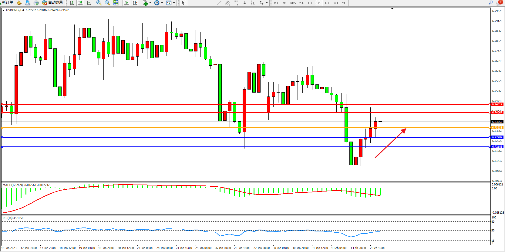 交易策略:6.73235上方看涨,目标6.74067、6.74517