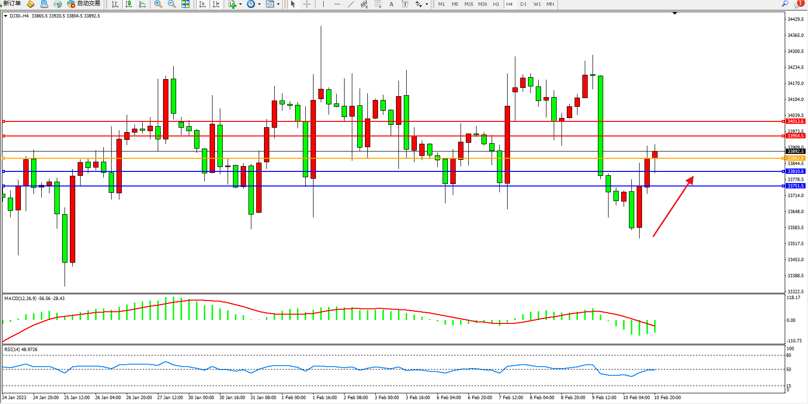 道琼斯指数DJ30——4小时K线图显示: