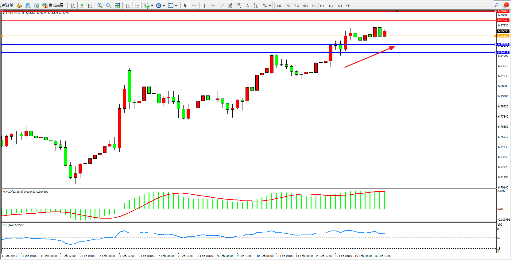 备选策略:6.86166上方看涨,目标6.87849、6.88765