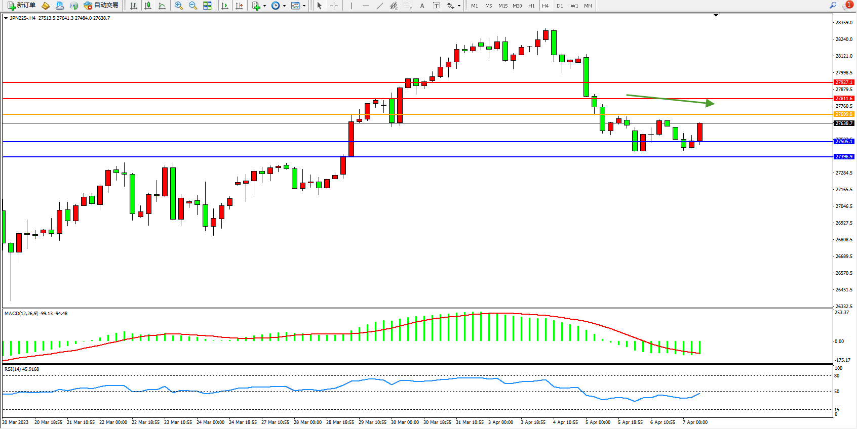 日经指数JPN225——4小时K线图显示: