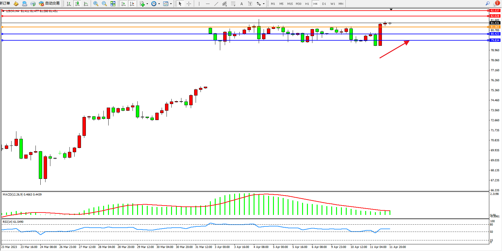 原油USOil——4小时K线图显示: