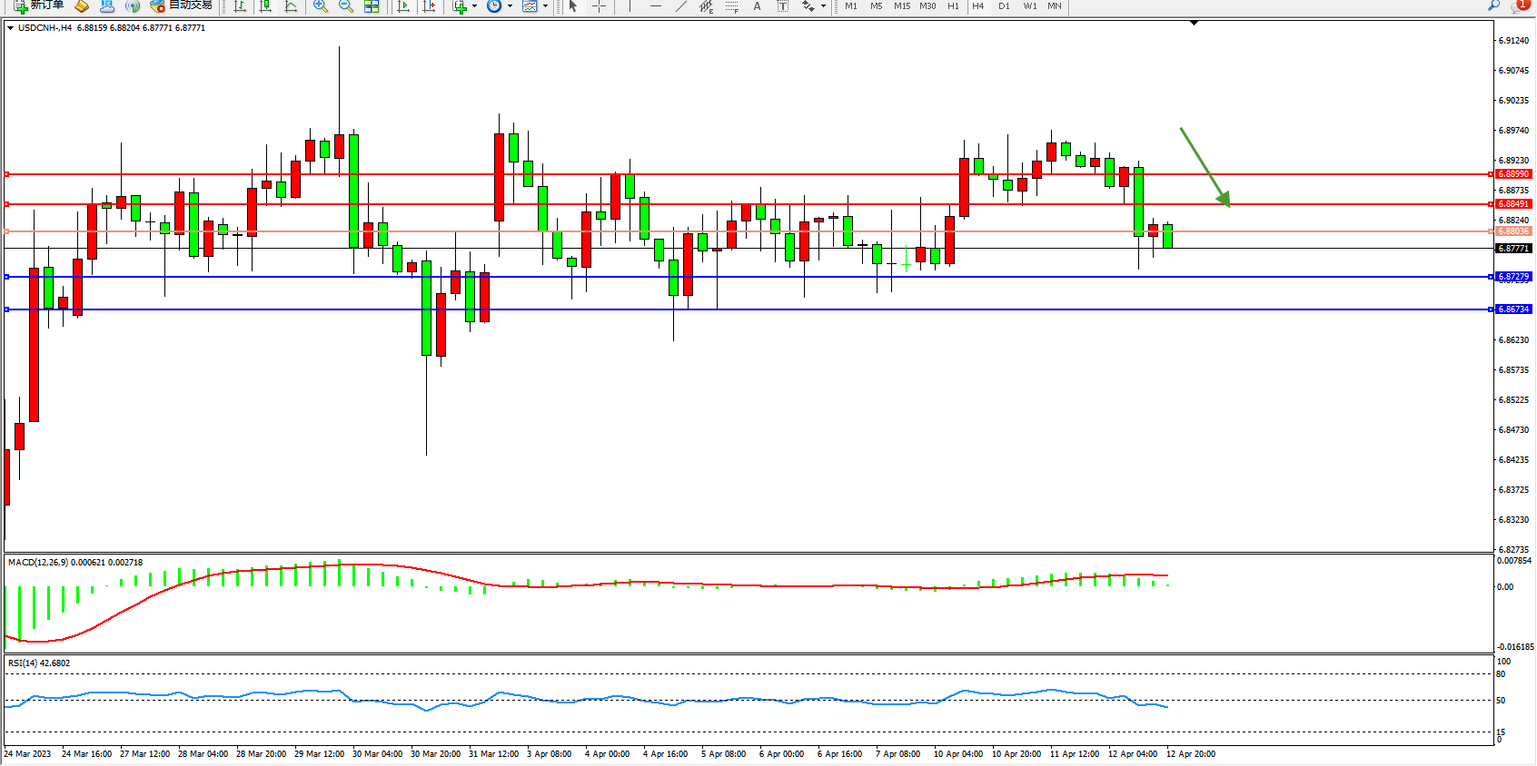 美元人民币USDCNH——4小时K线图显示: