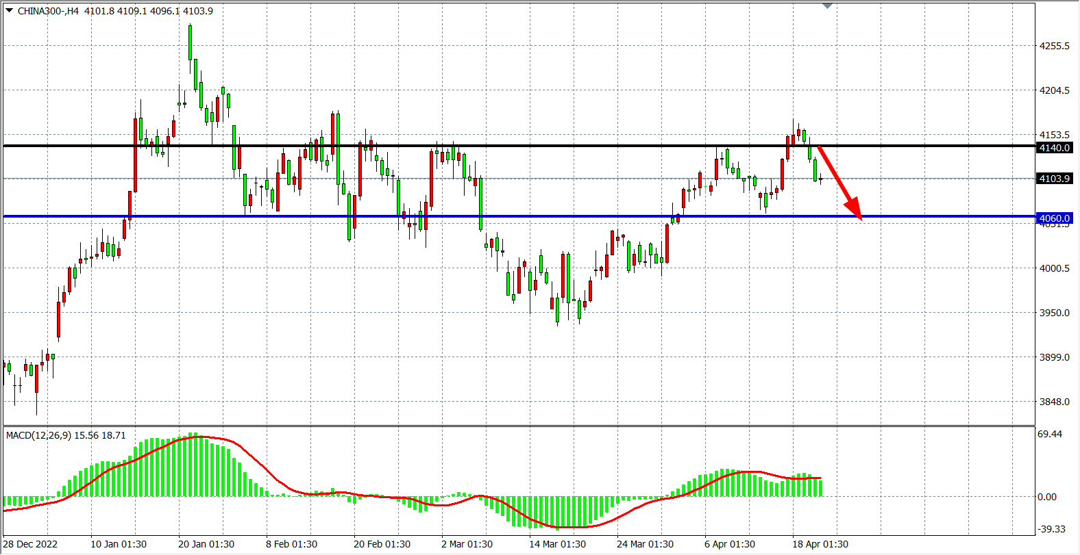 4小时图看,沪深300进一步走低,短期回调趋势明显,MACD量能在零轴之上有所缩量,关注4140阻力,在4140之下看回调,下方目标4060-4000附近。