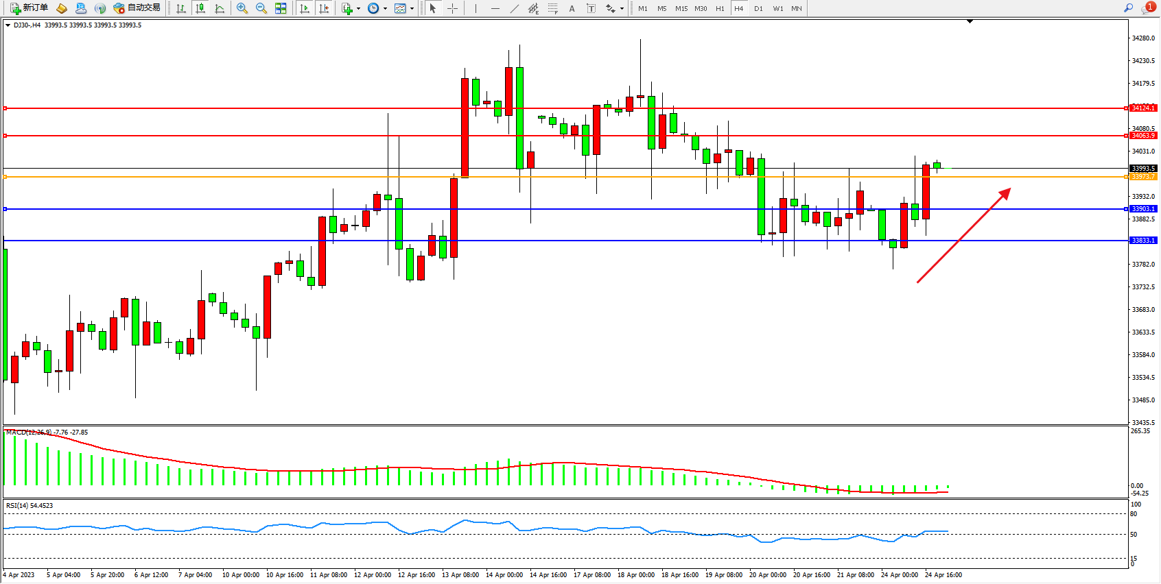 道琼斯指数DJ30——4小时K线图显示: