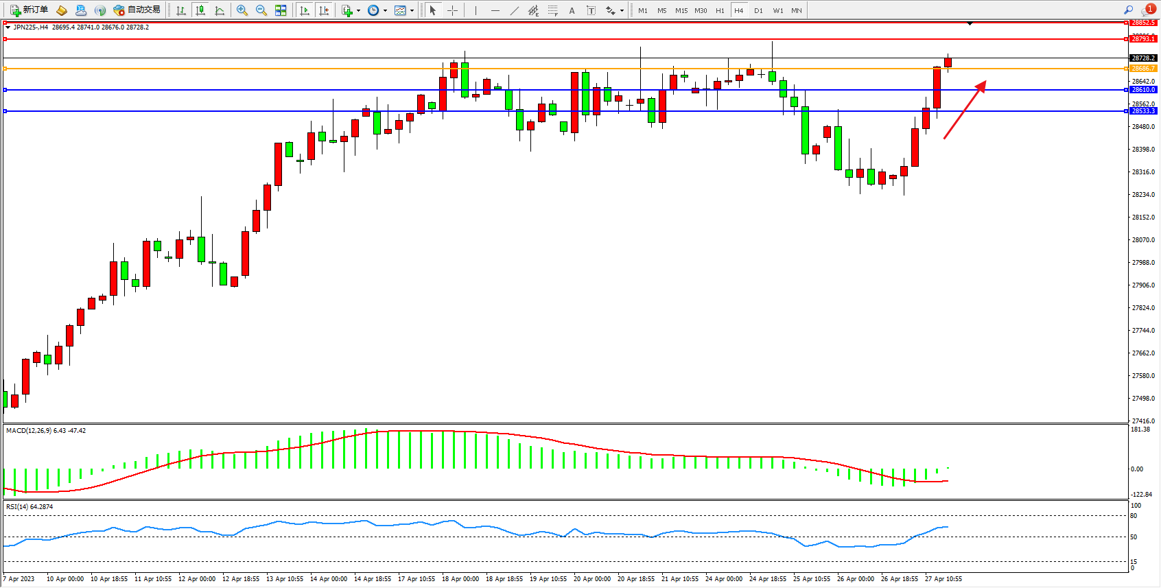 日经指数JPN225——4小时K线图显示:
