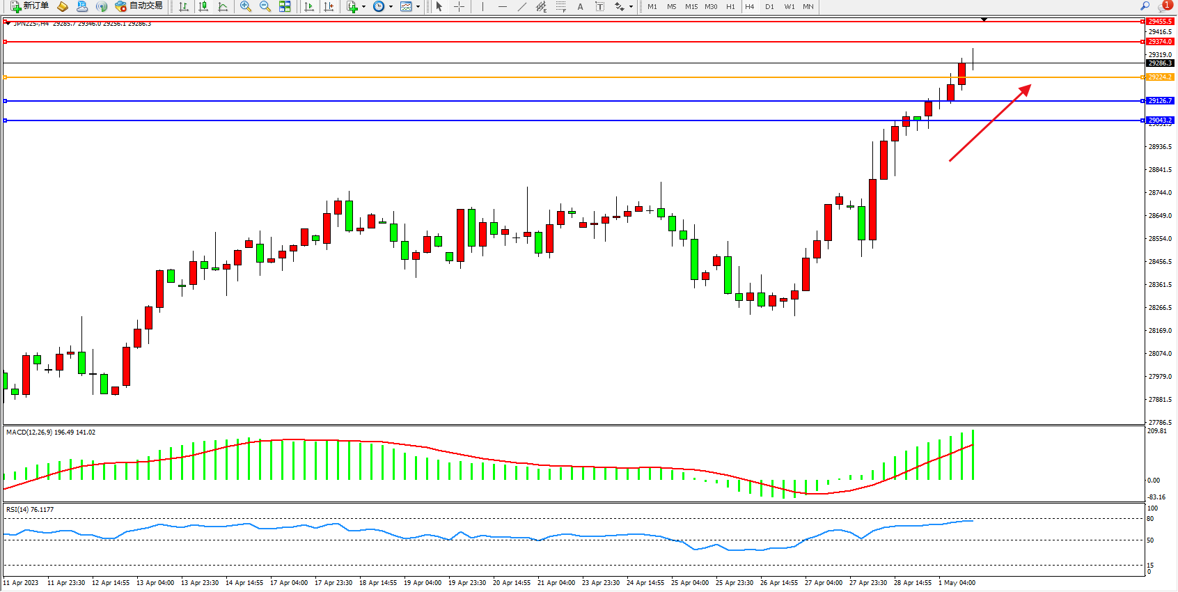 日经指数JPN225——4小时K线图显示: