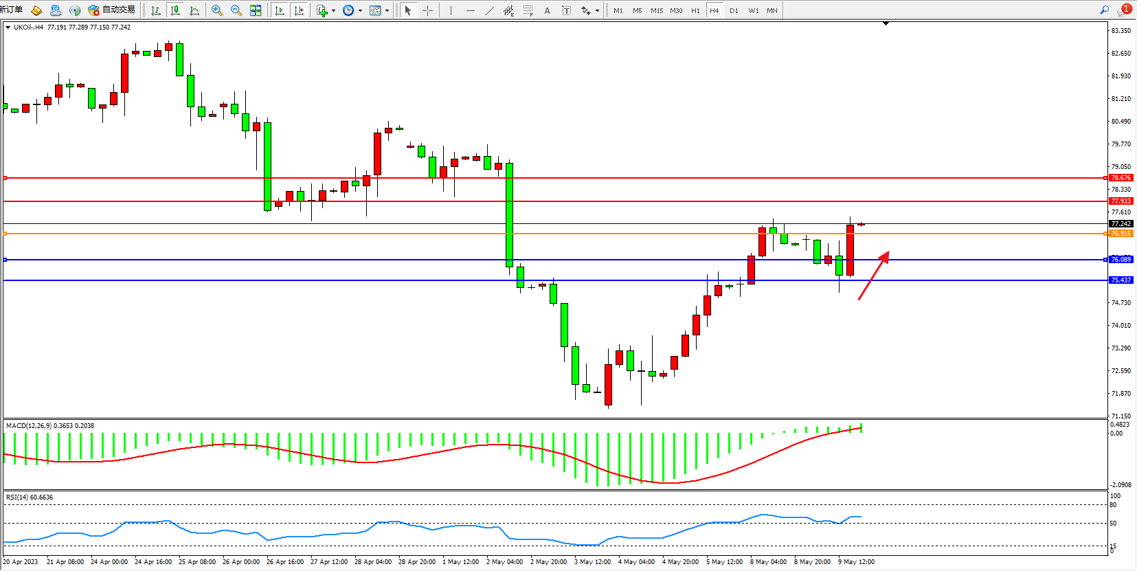交易策略:76.915上方看涨,目标77.933  78.676
